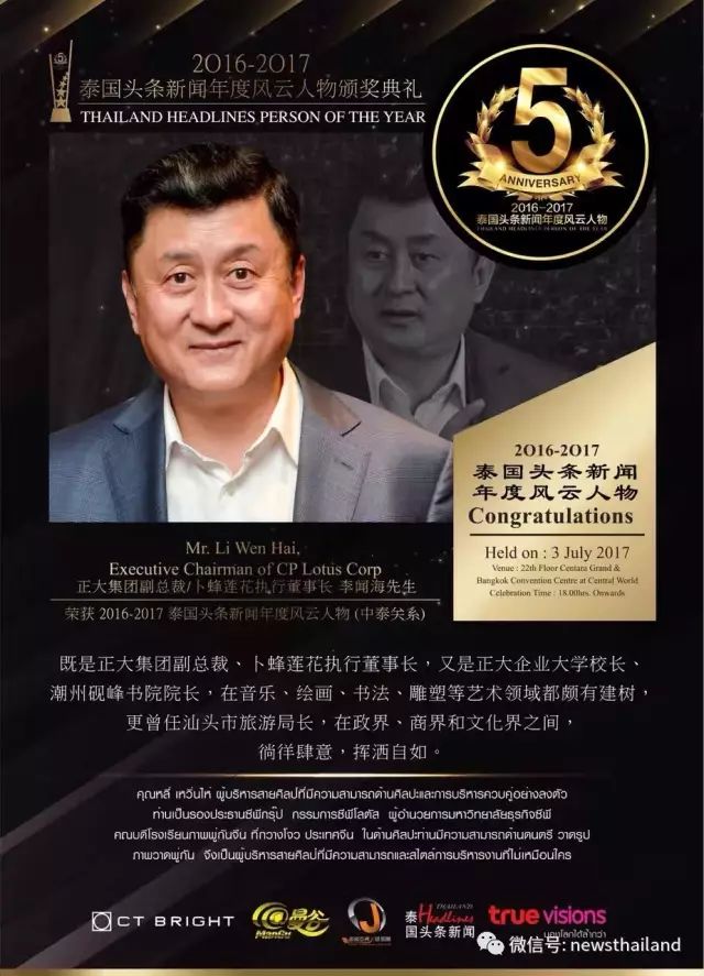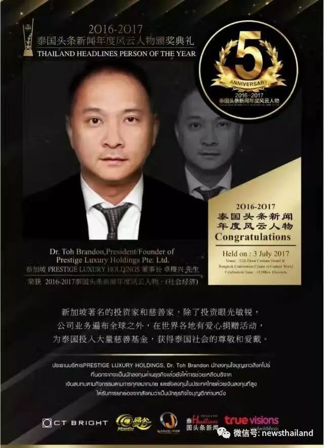 新加坡著名的投资家和慈善家,除了投资眼光敏锐,公司业务遍布全球之外,在世界各地有爱心捐赠活动,为泰国投入大量慈善基金,获得泰国社会的尊敬和爱戴。