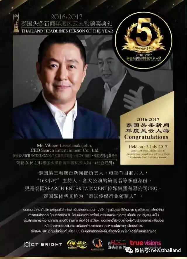 泰国第三电视台新闻部负责人,电视节目制片人,“168小时”主持人、各大公演的策划者等多重身份,更是泰国SEARCH ENTERTAINMENT传媒集团有限公司CEO,泰国媒体将其称为“泰国传媒行业领军人”。