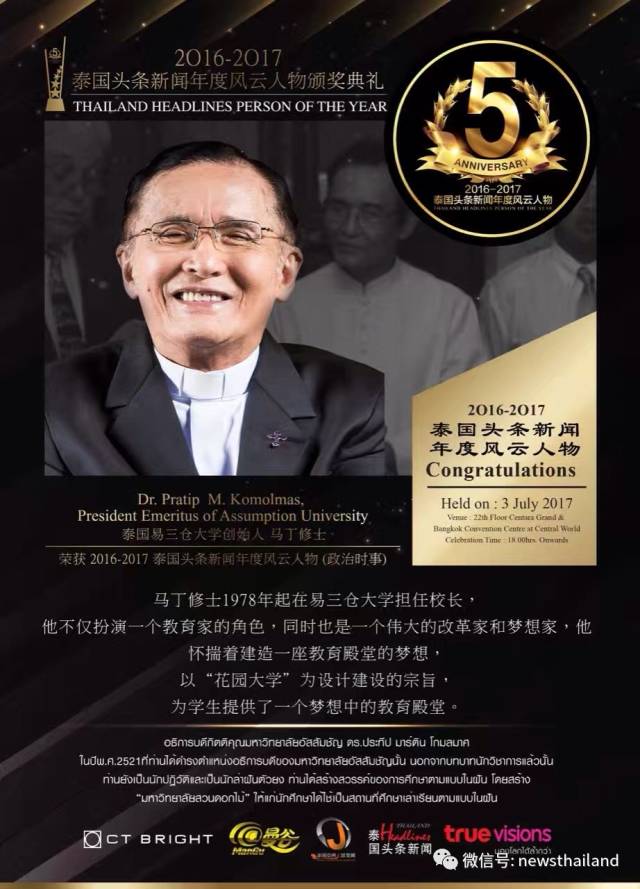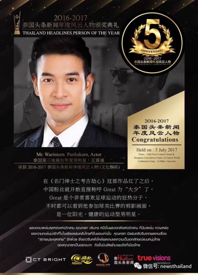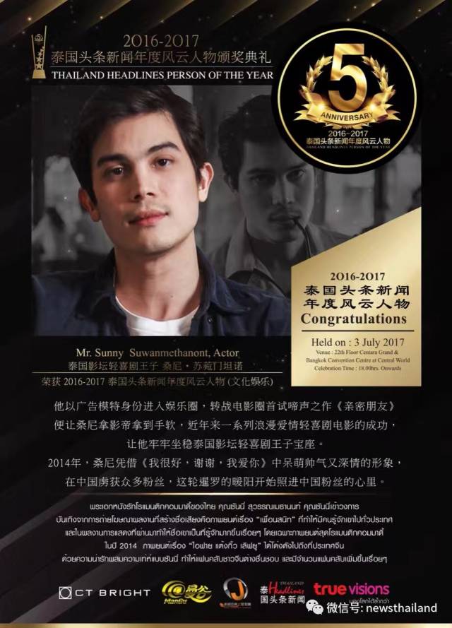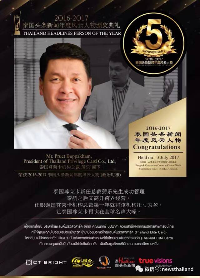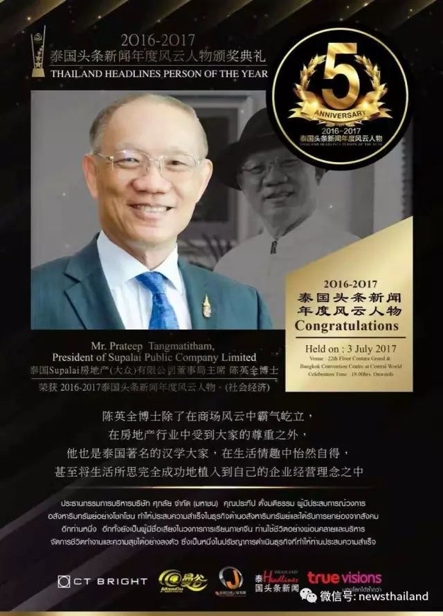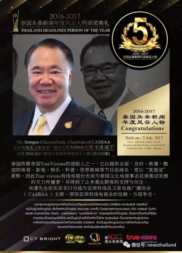 泰国传媒帝国TrueVisions的创始人之一,它以提供全面、及时、新潮、酷炫的体育、影视、娱乐、科普、世界新闻等节目而闻名,更以“真视觉”著称,因此True visions有线电视台也成为泰国文化电视事业在泰推动发展的主力传播者,并得到了众多观众群体的支持与关注。宋潘先生也实至名归的当选为亚洲有线及卫星电视广播协会( CASBAA )主席,领导亚洲有线电视业的发展,为国争光。