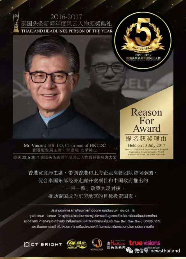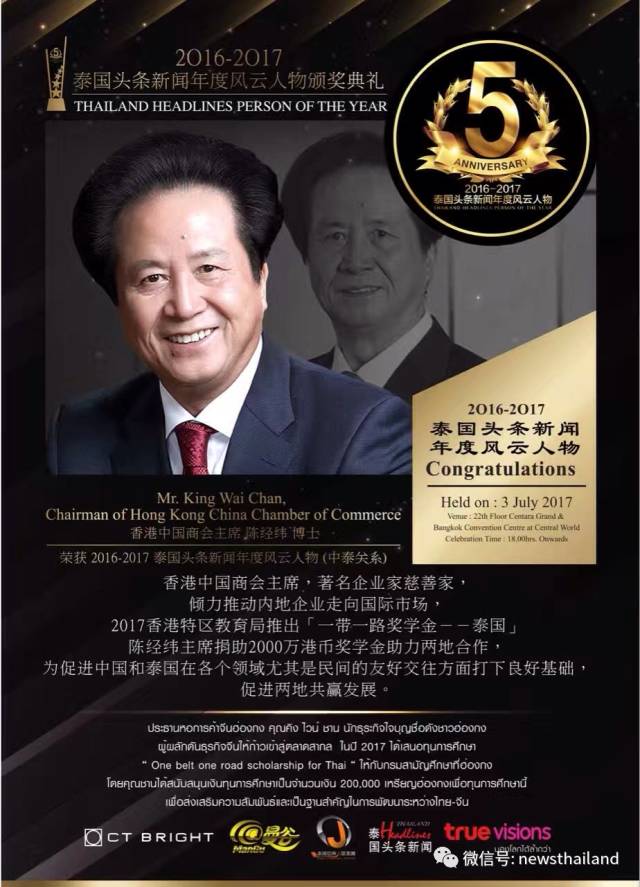 香港中国商会主席,著名企业家慈善家,倾力推动内地企业走向国际市场,2017香港特区教育局推出「一带一路奖学金--泰国」 陈经纬主席捐助2000万港币奖学金助力两地合作,为促进中国和泰国在各个领域尤其是民间的友好交往打下良好基础,促进两地共赢发展。