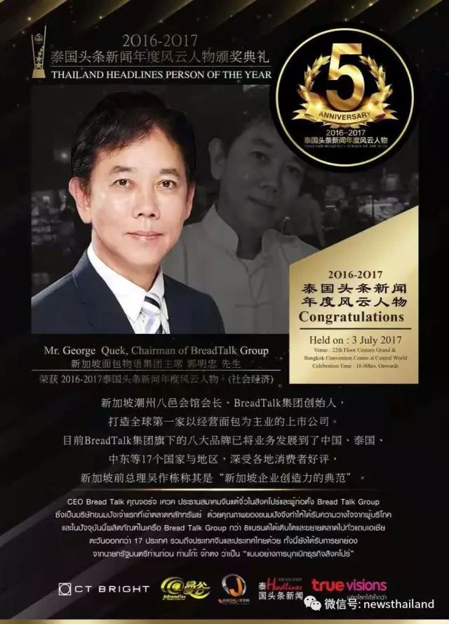 新加坡前潮州八邑会馆会长、BreadTalk集团创始人,打造全球第一家以经营面包为主业的上市公司。目前BreadTalk集团旗下的八大品牌已将业务发展到了中国、泰国、中东等17个国家与地区,深受各地消费者好评,新加坡前总理吴作栋称其是“新加坡企业创造力的典范”。