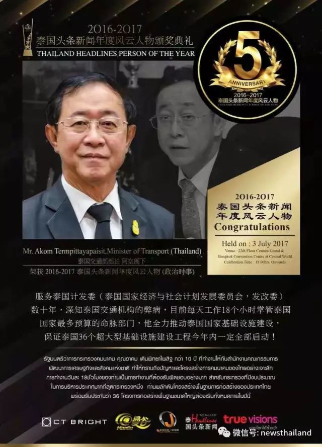 服务泰国计发委(泰国国家经济与社会计划发展委员会,发改委)数十年,深知泰国交通机构的弊病,目前每天工作18个小时掌管泰国国家最多预算的命脉部门,他全力推动泰国国家基础设施建设,保证泰国36个超大型基础设施建设工程今年内一定全部启动!