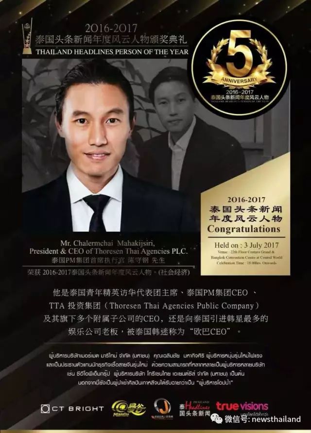泰国青年精英访华代表团主席、泰国PM集团CEO 、T TA投资集团(Thoresen Thai AgenciesPublic Company)及其旗下多个附属子公司的CEO,他是向泰国引进韩星最多的娱乐公司老板,泰国年轻的商业领袖之一,被泰国韩迷称为“欧巴CEO”。