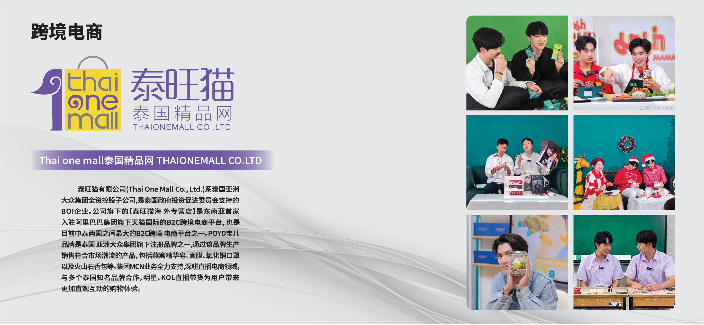 Thai One Mall 泰国亚洲大众集团全资控股子公司,公司旗下的【泰旺猫海外专营店】是东南亚首家入驻阿里巴巴集团旗下天猫国际的B2C跨境电商平台,也是目前中泰两国之间最大的B2C跨境电商平台之一;是泰国政府投资促进委员会支持的BOI企业、天猫国际支付宝国际东南亚首家合作企业。网址: