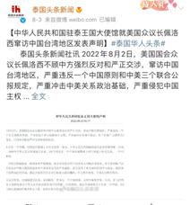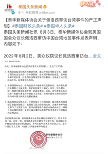 สำนักข่าว Thailand Headlines ในฐานะสื่อภาษาจีนในต่างประเทศ ได้ยึดมั่นในหลักการจีนเดียว ปกป้องอธิปไตยสาธารณรัฐประชาชนจีน วันที่ 3 สิงหาคม 2565 เกี่ยวกับกรณีการเยือนไต้หวันของ Nancy Pelosi ประธานสภาผู้แทนราษฎรของสหรัฐฯ ทางสำนักข่าว Thailand Headlines ได้ดำเนินการรวบรวมความคิดเห็นและคำแถลงการณ์จากสมาคมและองค์กรต่างๆ เพื่อสนับสนุนรัฐบาลจีน สัมภาษณ์บุคคลที่สำคัญและบุคคลที่มีชื่อเสียง เรียกร้องให้ออกมาแสดงความคิดเห็น และได้ออกแถลงการณ์และได้ร้องเรียนให้ฝั่งไทย โดยเฉพาะชาวเน็ตไทย อย่าพูดสิ่งที่ไม่เหมาะสมเกี่ยวกับการเมืองจีน เพื่อรักษาความสัมพันธ์ของทั้งสองประเทศ และเพื่อเป็นการผนึกความเป็นน้ำหนึ่งใจเดียวกันกับการต่อสู้ของจีนในการรักษาบูรณภาพแห่งดินแดน